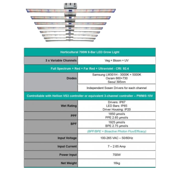 Most LED fixtures cut costs by using one single driver to run the entire fixture, inevitably compromising efficiency. The Hellion VS3 LEDs combine THREE separate drivers dedicated to veg, bloom and UV diodes, allowing new levels of system efficiency.
