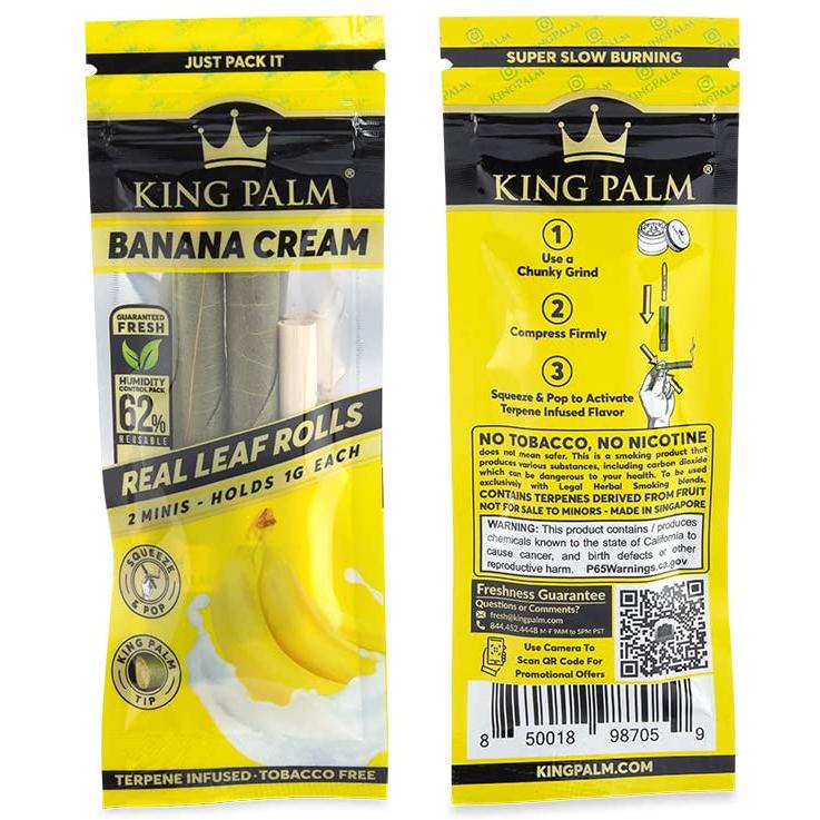 Each roll incorporates King Palms many innovations into an exquisite smoking experience. It all starts with the Cordia Palm leaf cones, a sustainably grown alternative to tobacco leaves and other rolling paper materials. The pre-rolled cones are outfitted with an all-natural corn husk filter tip. The Banana Cream flavors are located in a squeeze-and-pop ball in the filter.